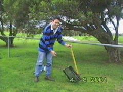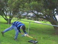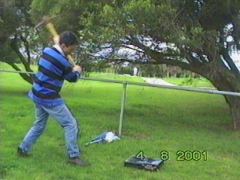 I can't say I'm accustomed to using a pick axe. Even less so on video recorders. So the first attempt penetrated the case, but didn't go all the way through. The second time was much better, going right through the VCR. As you can imagine, it looked kind of bizarre with a pick axe stuck in it. I had a couple more bashes at it for good measure - we figured the holes would aid ventilation - then we started getting ready for the main event.